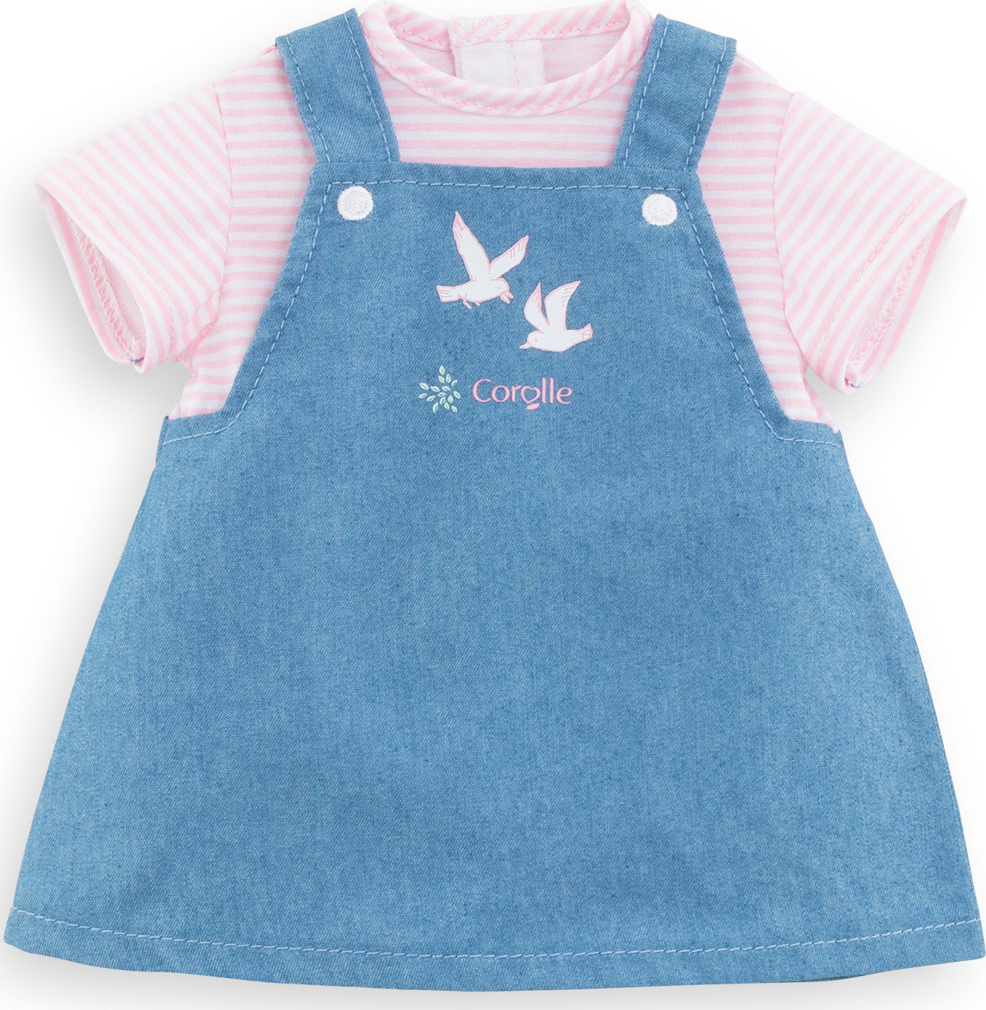 Dress up your little one's 12-inch doll in style with this adorable Jumper w/ Striped T-Shirt set! The denim jumper paired with a pink striped t-shirt with short sleeves is perfect for playtime or a fun day out. Suitable for children aged 18 months to 5 years, this outfit will spark your child's imagination and creativity as they play with their favorite doll. Add a touch of fashion and fun to your doll collection with this charming ensemble. Make playtime even more exciting with this trendy and versatile outfit for your child's beloved doll!